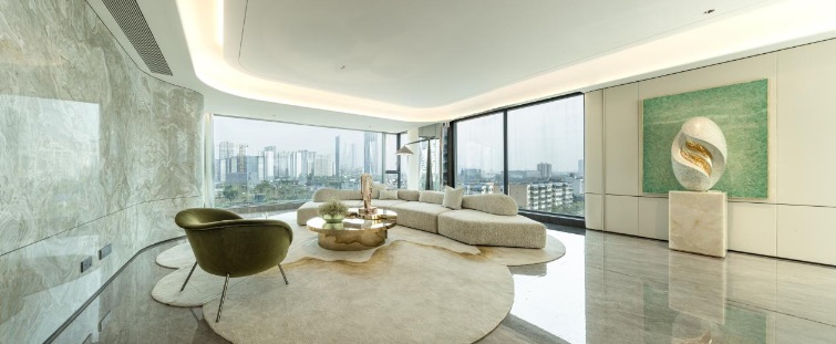 建面約245㎡地標景觀艙樣板間里,對望蜀峰468的天幕視野格外耀眼,超40米連續(xù)采光面,宣示著對城市領空的絕對主權,梵谷藝術公園、三圣鄉(xiāng)的繁華璀璨于此一覽無余。