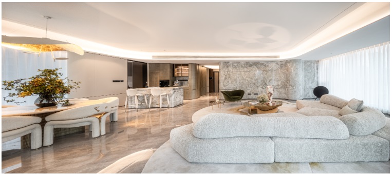 LDKB一體化宴會方廳,270°環(huán)幕全景采光,以城市天幕極景為背景,仿佛置身旋轉觀景臺。巨大的安第斯雪景奢石背景墻,為空間賦予奢華的質(zhì)感,蒸烤一體化設計餐廚臺可選配升降水龍頭,健康、智能的生活理念根植于空間的每一處設計。