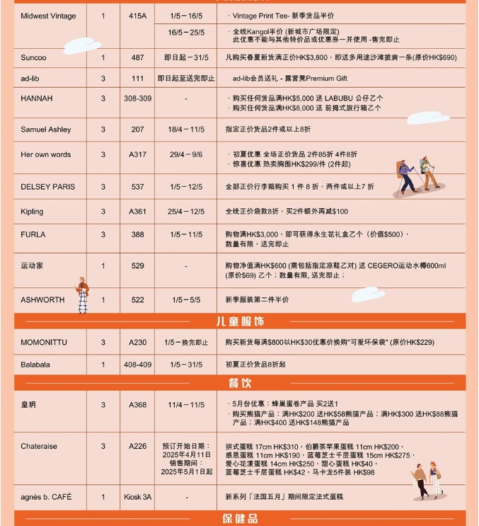 全場近40個品牌商戶為這次黃金周推出獨家優惠,尤其Sasa 即日起至5月15日的限時激賞,精選近300款熱門爆品低至25折發售,讓你買得盡興。品質女裝Theory在黃金周期間也推出限定獨家優惠,購滿指定金額低至75折;高爾夫專業服裝品牌 Ashworth即日起至5月5日也有購買新款衣服第二件半價的黃金周限時優惠,優惠多多,驚喜不斷。