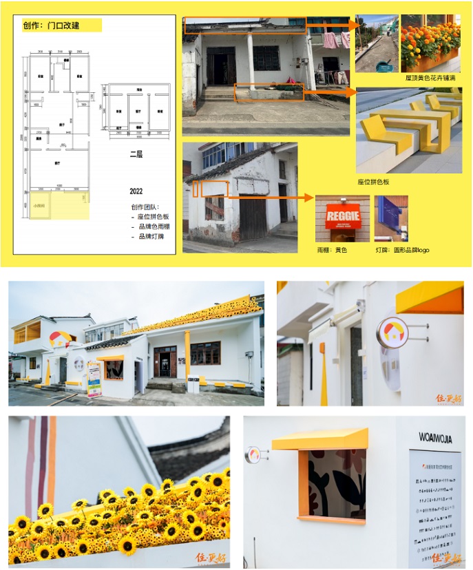 在他主導的《院子2022》改造項目中,對庭院、廚房、臥室等實用空間進行刷白修繕的同時,將藝術創作巧妙融入每一處場景,比如門口和小房間安置了光線座椅和屋頂黃色花卉光線裝置,還有品牌燈牌和主題雨棚,在前廳和廚房的墻面進行主題繪畫創作。