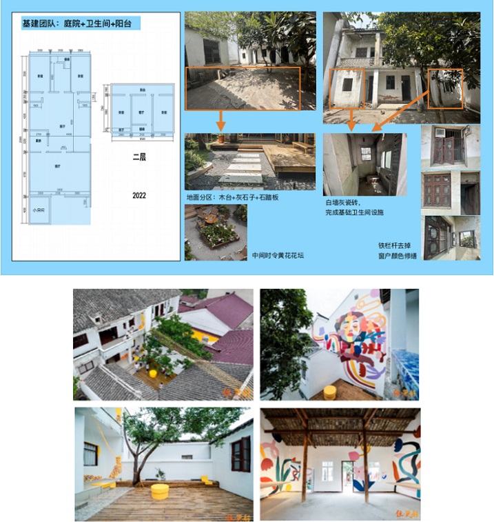 庭院作為公共活動的重要場所,在院子2022的改造中被賦予了新的活力。設計師對庭院地面進行精心分區,木臺、灰石子、石踏板錯落有致,墻面上的巨幅藝術繪畫使得整個庭院富有藝術氣息。在這里,居民們可以圍坐閑談、孩子們嬉戲玩耍,溫暖的鄰里情誼在此悄然生長。