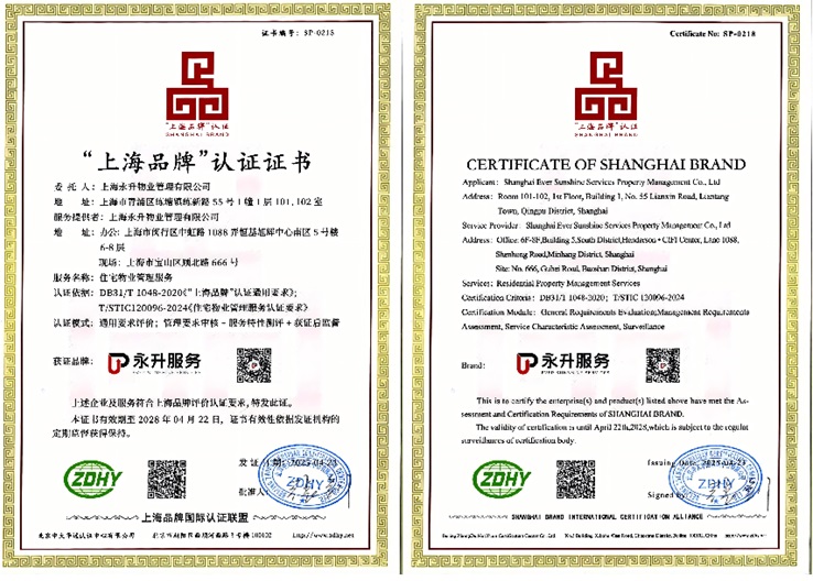 自2021年開始,永升服務著手準備“上海品牌”——住宅物業管理服務的認證,從標桿性組織自評報告(服務類)的撰寫到住宅物業管理服務團體標準的起草與發布,到現場評審,四年準備,其中評審過程橫跨兩年,最終獲得來之不易的“榮耀認證”。