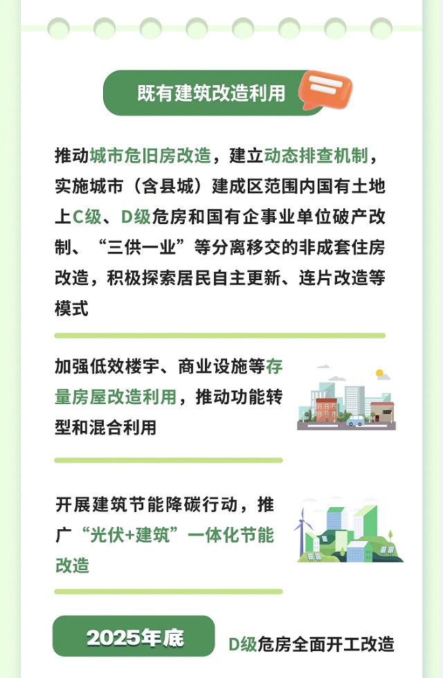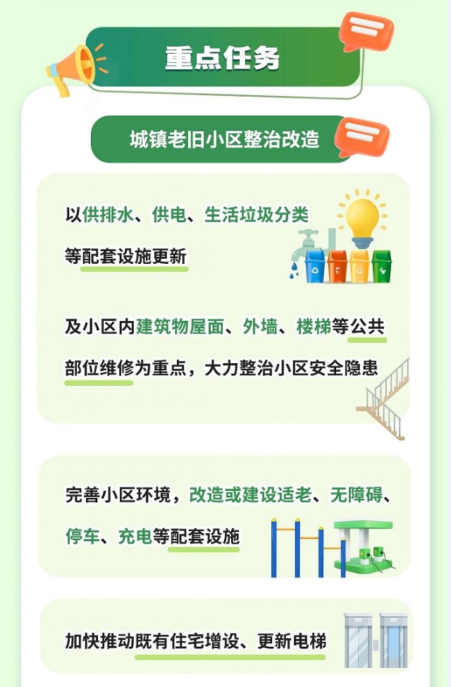 《行動方案》圍繞八大重點任務展開部署,包括圍繞城鎮老舊小區整治改造、城中村和老舊街區廠區更新改造、既有建筑改造利用、城市基礎設施更新改造、城市生態系統修復、歷史文化保護傳承、完整社區建設、城市功能完善,著力提升城市整體環境品質和綜合承載能力。