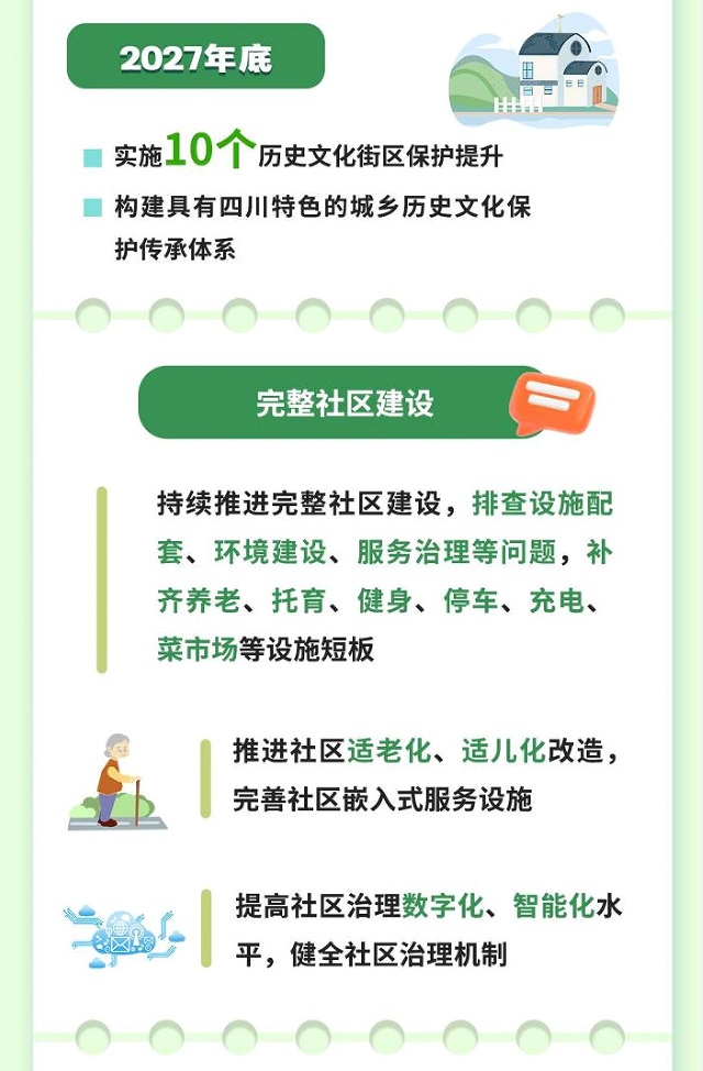 《行動方案》明確,到2027年底,四川建成50個城市更新重點片區樣板,支持各地以更新重點片區為載體整合資源、集成項目。到2030年,城市更新工作機制、支持政策、技術方法和管理制度更加完善,可持續城市更新模式基本形成。