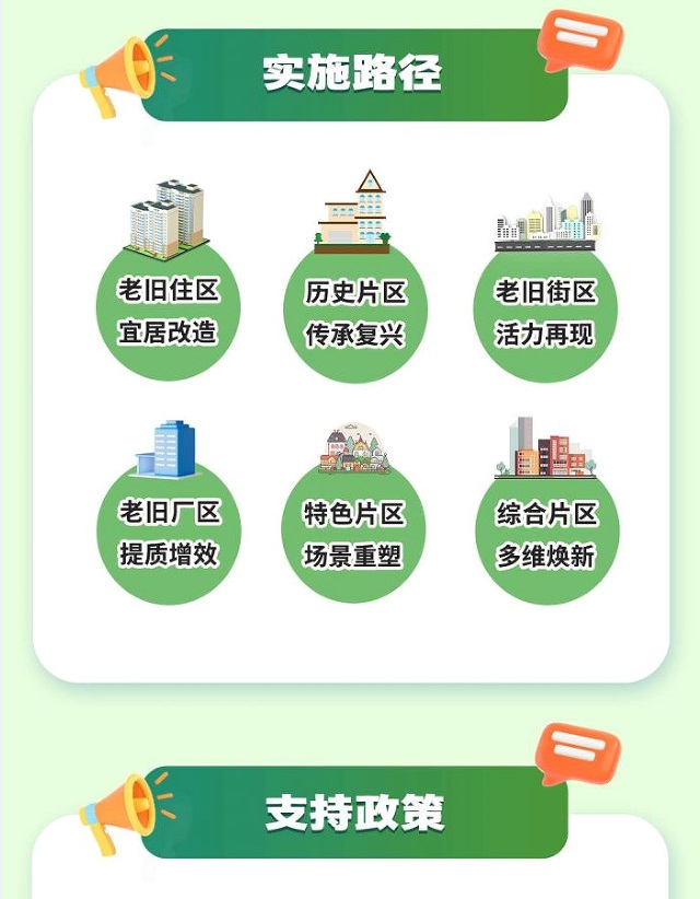 為保障更新行動順利推進,《行動方案》從優化土地政策、強化產權保障、優化規劃指標、創新金融財政政策、優化項目審批管理等五方面,明確了城市更新的具體支持政策,進一步釋放土地與空間潛力,激勵市場多元參與。