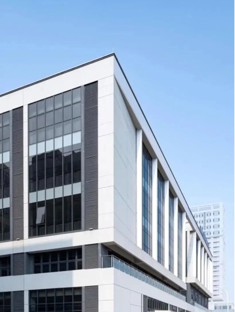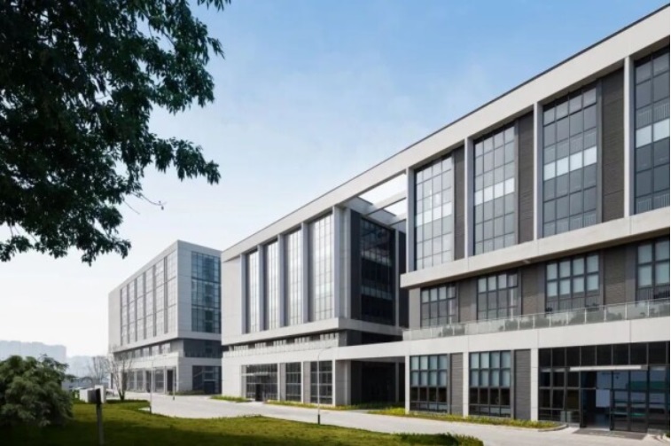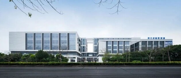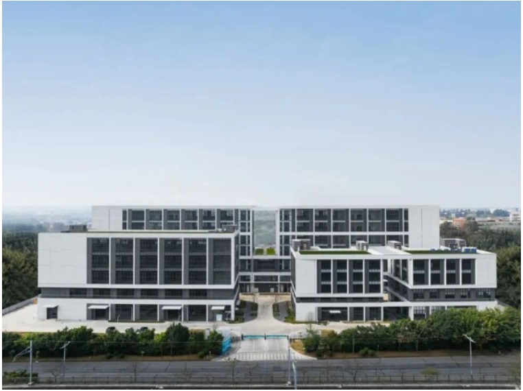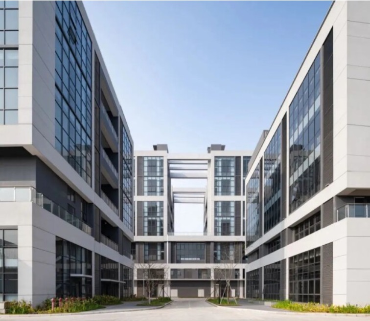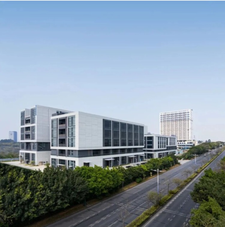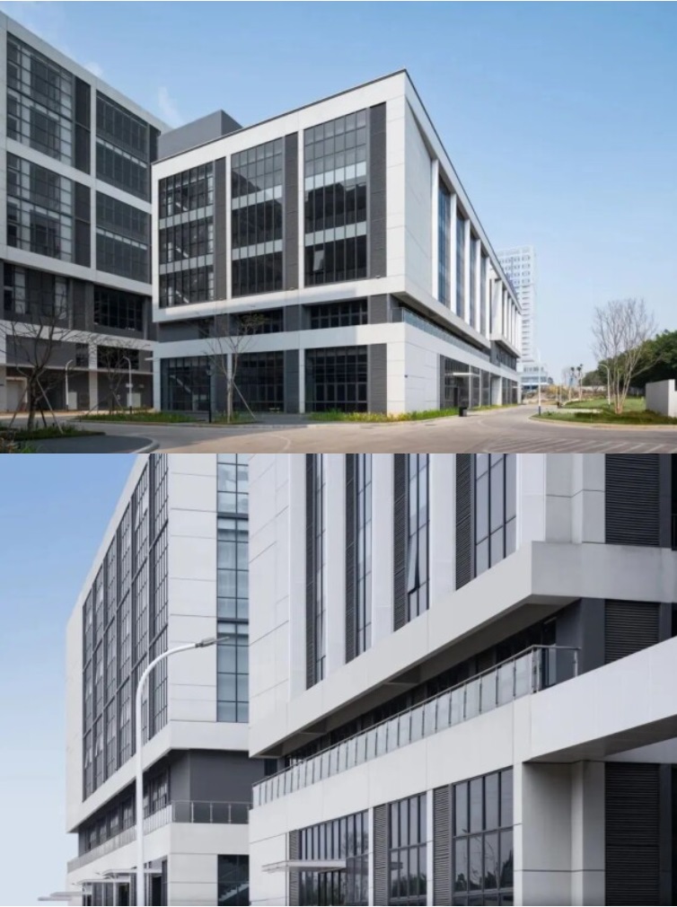 The standalone R&D buildings feature mid-low rise structures with clean façades, combining precast concrete and aluminum sunshades for modern industrial aesthetics. The companion office tower rises as a regional landmark, its innovative curtain wall design creating visual dynamism through fritted glass patterns.