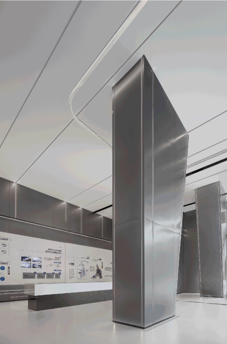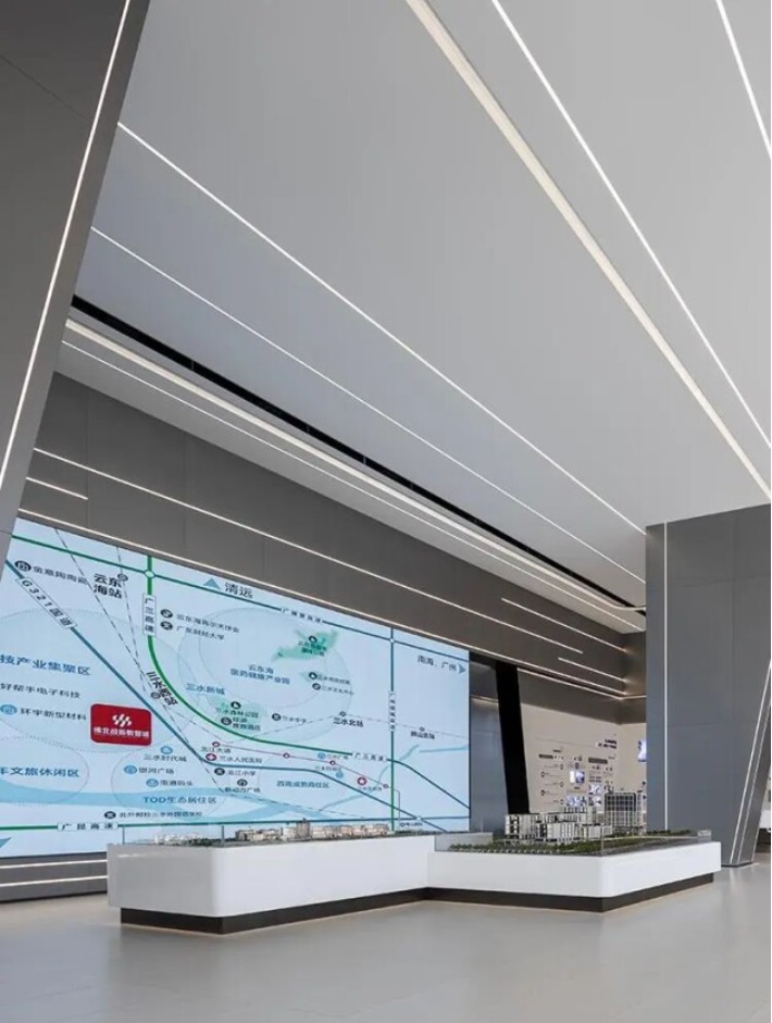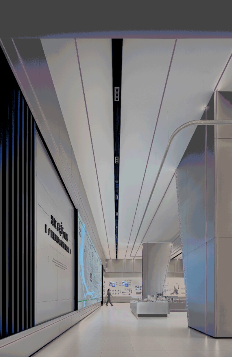 科技為骨:作為“科技營造”理念的核心。科技元素在招商中心的設(shè)計(jì)中無處不在,金屬鋁板、線性燈光、智能導(dǎo)覽系統(tǒng)和虛擬現(xiàn)實(shí)體驗(yàn)等元素,提升整體科技感與互動(dòng)性,成為了連接參觀者與園區(qū)科技創(chuàng)新成果的橋梁。