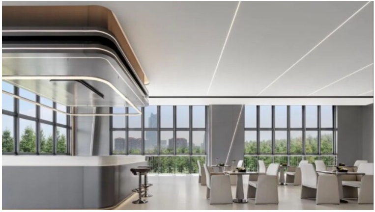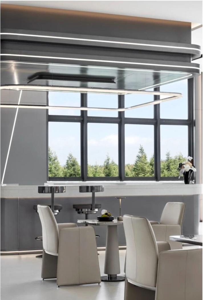 金屬材質(zhì)、鋁板等冷冽的材料成為空間的主調(diào),簡潔的線條和反射性表面不僅增強(qiáng)了空間的現(xiàn)代感,也為燈光效果提供了完美的載體。線性燈與幾何造型的燈光設(shè)計(jì)交織在空間中,提升了整體科技氛圍的層次感。