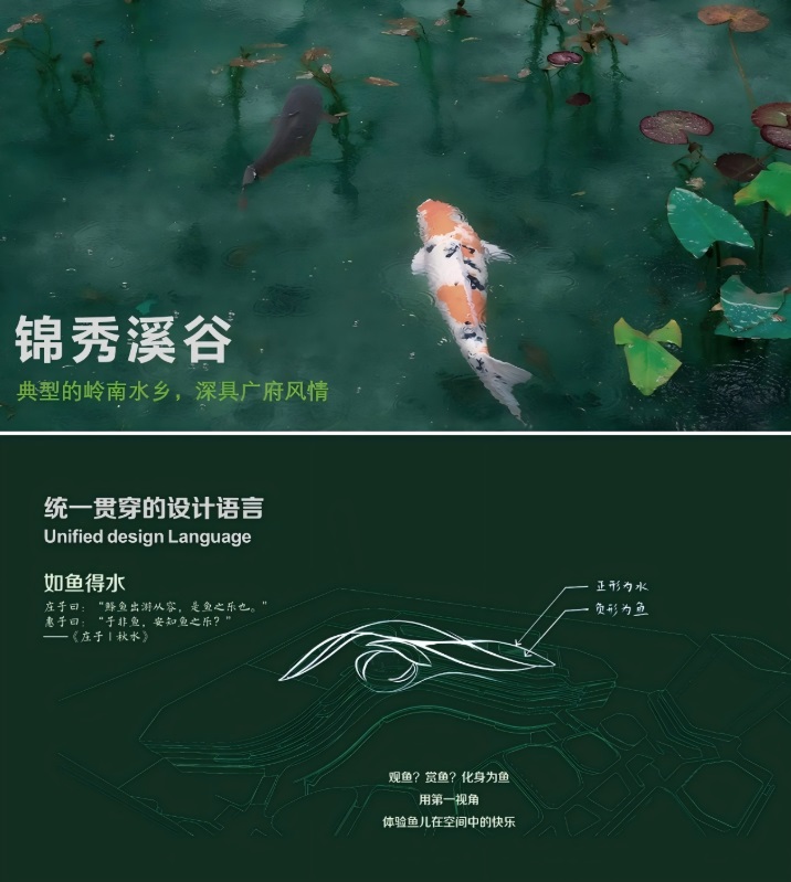 項(xiàng)目以“錦秀溪谷”為主題,援引漢樂(lè)府《江南》中“江南可采蓮,蓮葉何田田”的文學(xué)意象構(gòu)建“魚(yú)戲斗門(mén)東 / 南 / 間”的沉浸式體驗(yàn)空間序列。