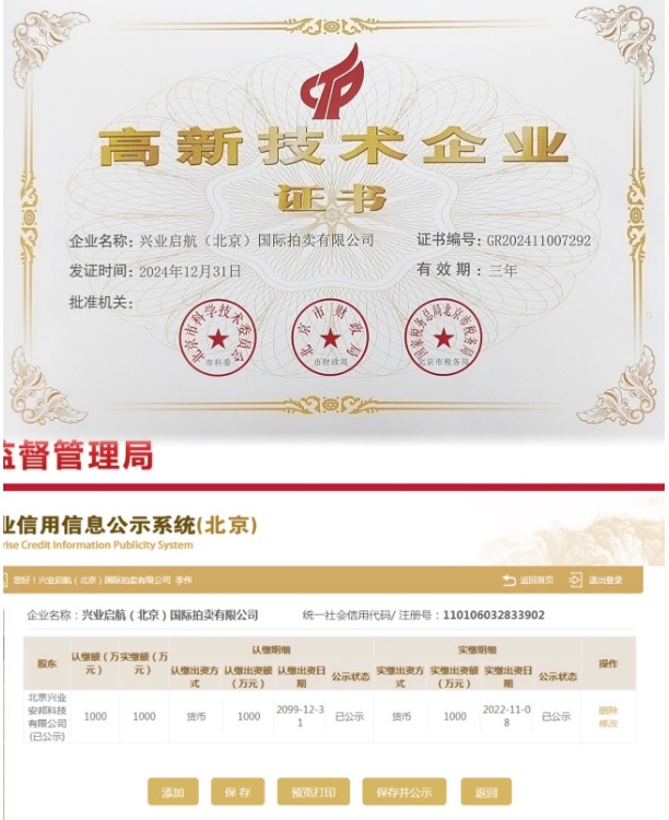 目前,興業拍賣網實繳資金達一千萬,使客戶更加信任,服務更加安心。公司還憑借在互聯網拍賣技術研發與應用方面的突出成果,成功獲得國家高新技術企業認證,這一認證是對其技術實力和創新能力的高度認可。