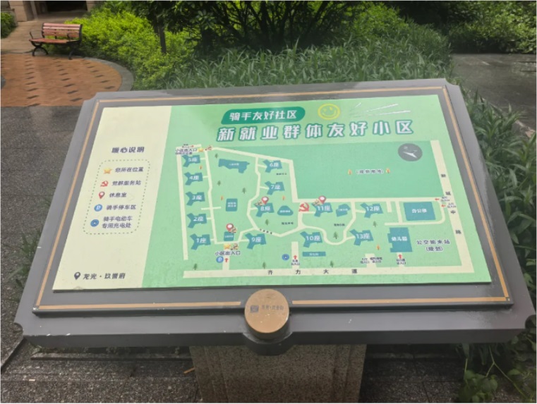 為幫助外賣騎手迅速找到目的地,龍光智慧服務在小區精心制作了騎手友好社區地圖,除了清晰標注樓棟位置外,還為騎手標注了沿路配套場所,便于騎手快速識別所處區域位置。不僅如此,龍光智慧服務還在佛山玖譽府等小區專設騎手充電站,讓每一單都“滿格”待發。