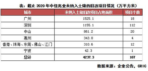 奧園2015年入局城市更新,2020年便達到逾3000萬方規模。第二梯隊中,奧園在2020年上半年的表現較為亮眼,據企業中報,期內簽約了珠海聯安舊村改造項目、東莞清溪鎮荔枝村南更新項目等,通過城市更新渠道獲得1633萬方土儲建面的凈增長,總規劃建面達3058萬平方米,涵蓋超50個項目。粵港澳大灣區仍是城市更新重點布局區域,可售資源占比達95%,除此之外,廊坊、西安、清遠、梅州、南寧也有所分布。實際上,發家于廣州的粵系房企奧園在2015年才開始布局舊改,但無論是拓展速度還是轉化速度都較為突出,20年上半年共實現了4個項目的轉化,釋放了64萬方的土儲建面,預計下半年還能轉化8個項目,再提供480萬方的總建面。除此之外,管理層還表示,下半年通過城市更新渠道拿地建面占比將從7%調整到15%左右。奧園之所以能在競爭激烈的大灣區舊改市場突圍而出,主要有兩方面原因:首先,業務覆蓋了“三舊”(舊城、舊村、舊廠)改造,涉及類型全面;其次,選擇了珠海作為城市更新主戰場,打造多個標桿項目。珠海奧園廣場作為奧園在珠海的首個城市更新項目,從2015年啟動到2018年7月正式建成開業僅用約三年時間,成為集大型購物中心、主題商業步行街、精品住宅、高端寫字樓、酒店等五大業務為一體的大型綜合體。該項目成功打響了企業在珠海的品牌,此后在珠海簽約了10多個項目。