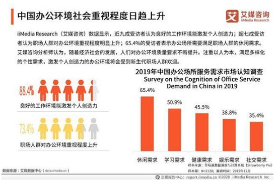 伴隨著新經濟的蓬勃發展,創新能力成為大量企業的發展重點,企業也開始關注辦公環境對員工創造力的影響。艾媒咨詢數據顯示,超七成受訪者對辦公環境重視度明顯上升,近九成受訪者認為辦公環境與激發創造力之間存在直接關聯。聯合辦公正因其更具體驗化、更能激發創造力的辦公場景而被更多企業選擇。