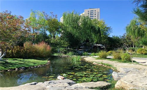 看似是一處普通的城市公園,其實是北京首個小微濕地保護修復示范項目。整個園區的建設中充分運用了海綿城市建設理念,通過整理地形、駁岸,基底鋪設沙土亂石層,營造近自然水系,10余種水生植物的種植在這里形成了一個“自循環”,也讓習慣了鋼筋叢林的人們,在這里,感受四季更迭,享受放松的時刻。