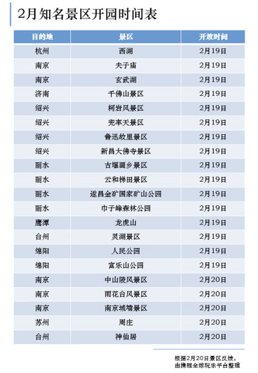 2月20日,攜程全球玩樂平臺發布了首批“知名景區開放時間表”,根據景區公布的信息,包括杭州西湖;南京夫子廟、玄武湖;濟南千佛山景區、紹興柯巖風景區、魯迅故里景區;浙江麗水古堰畫鄉景區、云和梯田景區;江西鷹潭龍虎山;蘇州周莊;浙江臺州神仙居等20多家知名景區已于2月20日前開園。