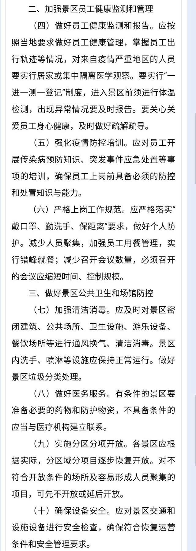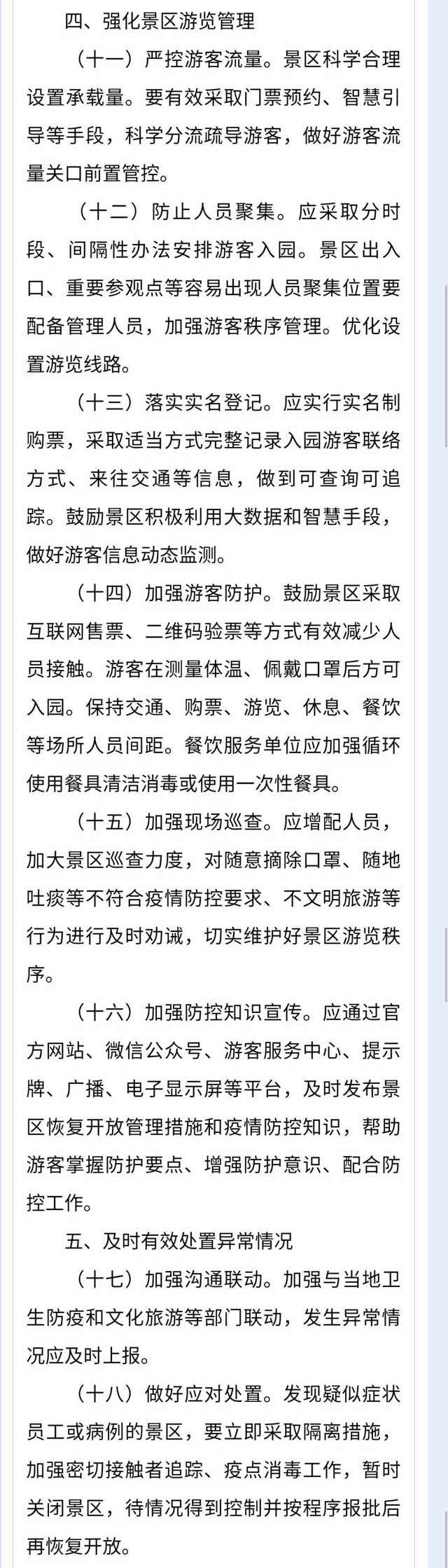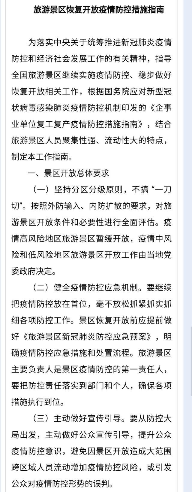 【文旅部緊急發文:#疫情高風險地區景區暫緩開放#】#避免景區開放引發公眾誤判#文化和旅游部資源開發司25日印發《旅游景區恢復開放疫情防控措施指南》,疫情高風險地區旅游景區暫緩開放,疫情中風險和低風險地區旅游景區開放工作由當地黨委政府決定。避免因景區開放造成大范圍跨區域人員流動增加疫情防控風險,或引發公眾對疫情防控形勢的誤判。應實行實名制購票,采取適當方式完整記錄入園游客聯絡方式、來往交通等信息,做到可查詢可追蹤。