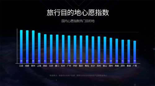 具體來看,目前國內(nèi)的疫后心愿指數(shù)整體前三名分別是三亞、成都、貴州。其中三亞、成都和貴州的綜合指數(shù)分別達(dá)到68、67和66。從出境市場來看,除了泰國、日本、新加坡三個“老朋友”,目的地心愿指數(shù)排名靠前的目的地還包括越南、迪拜、印度尼西亞、馬來西亞等國家或地區(qū)。