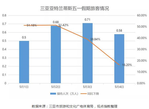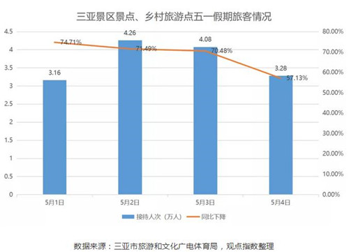 另外,國內(nèi)熱門旅游城市三亞,其景區(qū)景點、鄉(xiāng)村旅游點在5月1日-4日,累計接待游客14.78萬人,已恢復至去年同期水平的30.22%。