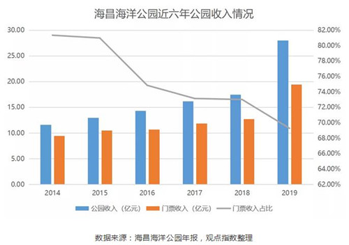 盡管近年來海昌一直注重增加非門票收入,力圖使收入多元化。但是根據(jù)2019年年報,海昌海洋公園運營分部總收入為28.02億元,其中門票收入達到了19.41億元,占比達到69.27%,依然相當高。