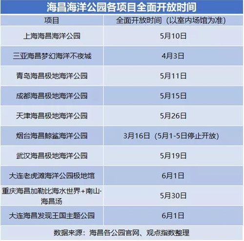 據(jù)觀點指數(shù)整理,以開放室內(nèi)場館時間作為全面開放標志,除煙臺海昌鯨鯊海洋公園及三亞海昌夢幻海洋不夜城是在5月之前開放(煙臺海昌鯨鯊海洋公園在5月1日-5日關閉),其余大部分均在5月中才全面開放,大連的兩個項目更是到6月1日才全面開放。
