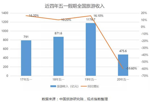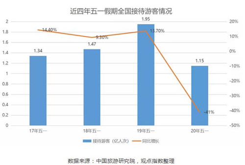 數(shù)據(jù)顯示,2020年五一假期期間,國內(nèi)旅游接待總人數(shù)1.15億人次,同比減少41.0%;實現(xiàn)旅游收入475.6億元,同比減少59.6%;人均旅游消費413.57元,同比下跌31.5%。