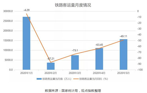 從鐵路數(shù)據(jù)上看,5月鐵路客運量15675.3萬人,同比下跌49.11%;1-5月累計鐵路客運量65179.01萬人,同比下跌55.55%。對比來看,鐵路運輸客運量環(huán)比上升40%,而民航則上升54.54%,可見民航運輸在逐步放開國內(nèi)航線,國外航線也在適當增加彈性的背景下,也在跟隨快速恢復。