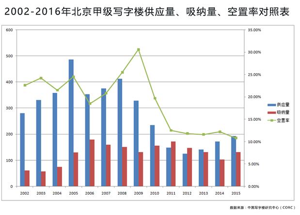 中國寫字樓研究中心(CORC)統計查顯示,2015年北京甲級寫字樓市場新增供應達193萬平方米,較2014年增加12.2%。2015年寫字樓市場成交面積133萬平方米,同比下降29.1%;成交均價32253元/㎡,同比下降6.6%;成交金額310億元,同比上漲17%。