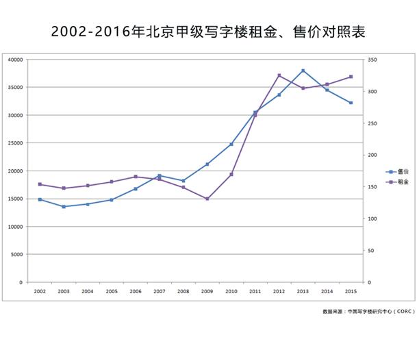 根據中國寫字樓研究中心(CORC)的最新統計數據,截止2015年12月,北京寫字樓市場平均售價32253元/平方米(建筑面積報價),與2014年同比下降6.6%;平均租金323元人民幣/平方米/月(建筑面積報價),與2014年同比上升3.8%;平均空置率10.8%,與2015年同比下降11.5%。