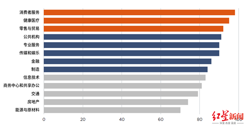 為探究樓內不同行業(yè)租戶對地鐵交通的依賴程度,第一太平戴維斯計算出各行業(yè)租戶的地鐵粘性指數——