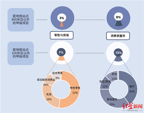 在成都,距離地鐵站點100米內的甲級寫字樓里的零售與貿易和消費者服務企業(yè),相比離地鐵站點超過800米的情況,辦公面積高4到5個百分點。