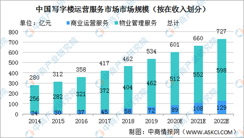 中國寫字樓運營服務市場近年來保持了快速增長。2014年中國寫字樓運營服務市場總收入280億元,2019年的534億元,復合年增長率為13.8%。隨著商業(yè)運營服務市場高速增長,預計2020年中國寫字樓運營服務市場總收入將達601億元,2022年將增至727億元。