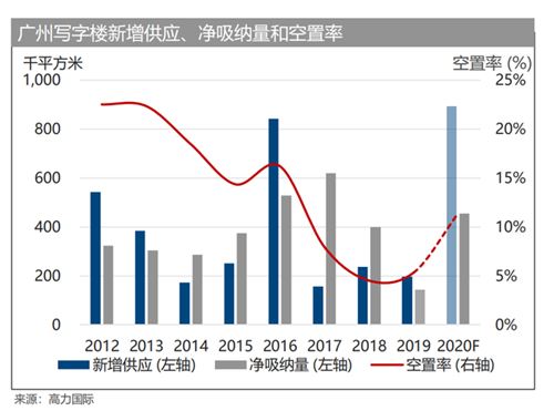 高力國(guó)際報(bào)告顯示,2020年廣州寫字樓新增供應(yīng)達(dá)到頂峰,新增可租賃面積達(dá)到89萬(wàn)平方米,比2017年至2019年三年的供應(yīng)總和(59萬(wàn)平方米)還高出51%,空置率預(yù)計(jì)從由5.3%攀升至11.4%;深圳則將有約112萬(wàn)平米的新增甲級(jí)寫字樓入市,同比2019年高出58%,空置率預(yù)計(jì)從21.2%微升至24.9%。