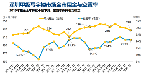 戴德梁行則在《深圳寫字樓市場(chǎng)2019年第四季度》報(bào)告中指出,雖然2019年第四季度市場(chǎng)租賃成交活躍度較三季度略有回升,但成交主要以更低租金、更小面積的換租需求為主,市場(chǎng)整體吸納情況不容樂(lè)觀。業(yè)主給予的優(yōu)惠租金及補(bǔ)貼將一定程度抹平違約租期的影響,預(yù)計(jì)2020年對(duì)優(yōu)質(zhì)客戶的爭(zhēng)奪還將持續(xù),不過(guò)隨著換租需求的逐漸消耗及持續(xù)的高供應(yīng),甲級(jí)寫字樓的租金及空置率或承受更大壓力,而最終能扭轉(zhuǎn)市場(chǎng)表現(xiàn)的新增需求則將依賴于經(jīng)濟(jì)環(huán)境的改善。
