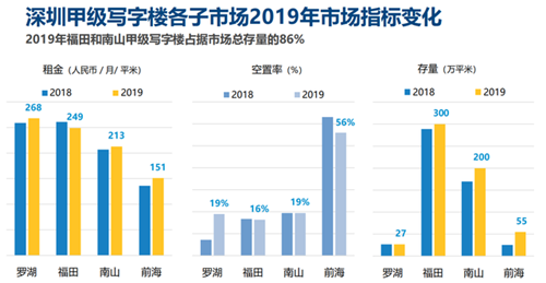 相較之下,2019年以來(lái),深圳寫字樓市場(chǎng)情況一直是市場(chǎng)關(guān)注的焦點(diǎn)。據(jù)第一太平戴維斯發(fā)布的數(shù)據(jù),2019年深圳全年累計(jì)共有107.7萬(wàn)平方米新增寫字樓面積交付入市,同比擴(kuò)大49.1%,推動(dòng)深圳甲級(jí)寫字樓總存量同比上升17.7%至715.6萬(wàn)平方米。
