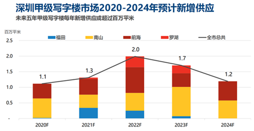 不止2020年的新增供應(yīng),深圳從2020年到2024年的未來(lái)5年間,總共會(huì)有約732萬(wàn)平方米的新建甲級(jí)寫字樓體量入市,且主要集中在南山和前海。