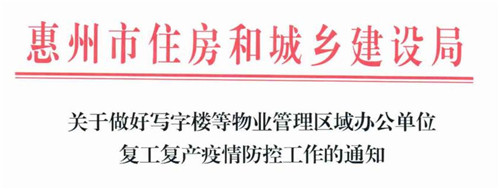 2月9日,惠州市住建局發出《關于做好寫字樓等物業管理區域辦公單位復工復產疫情防控工作的通知》(下稱《通知》),要求各縣(區)住建局、房管局(中心),市物業管理協會,各物業服務企業,切實做好寫字樓區域辦公單位復工復產疫情防控工作,堅決防止疫情擴散蔓延。