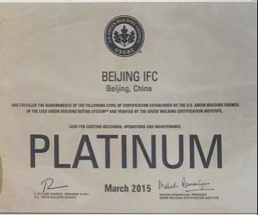 北京IFC同步國際節能、環保設計標準,榮獲LEED-EB鉑金級認證。