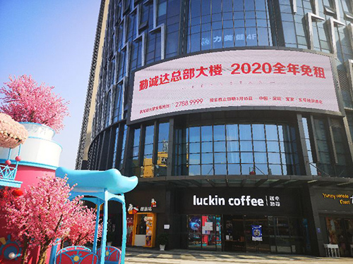 2月26日下午,記者來到位于寶安區新安三路的勤誠達總部大樓。剛出五號線洪浪北地鐵站口,抬頭就看到了大樓LED屏展示:“勤誠達總部大樓,2020全年免租”、“你復工我賦能”。