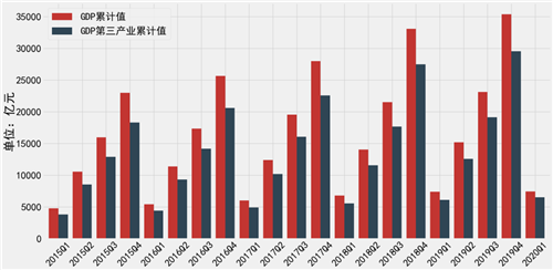 圖:2015年Q1~2020年Q1北京GDP累計值和GDP第三產業累計值(單位:億元)