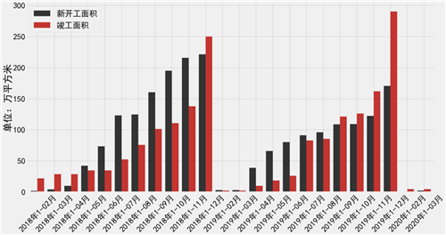 圖:2018年1月~2020年03月北京寫字樓新開工和竣工面積(單位:萬㎡)