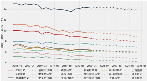 圖:北京9大商圈甲乙級寫字樓歷史租金及未來走勢預測(2018年9月~2021年3月)