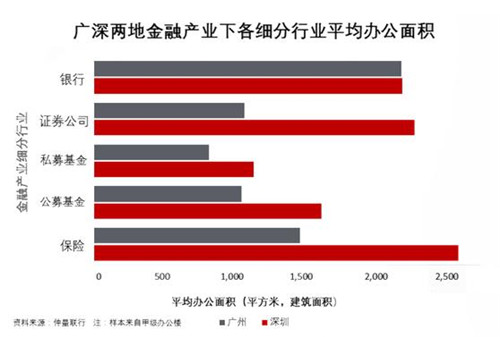 這一系列的制度創(chuàng)新舉措將利好境內(nèi)外金融機(jī)構(gòu)在大灣區(qū)內(nèi)地業(yè)務(wù)的快速發(fā)展,為深圳和廣州的辦公樓市場需求帶來新的增長點(diǎn)。從仲量聯(lián)行統(tǒng)計(jì)的金融產(chǎn)業(yè)各細(xì)分行業(yè)在甲級(jí)辦公樓中平均辦公面積結(jié)果可知: