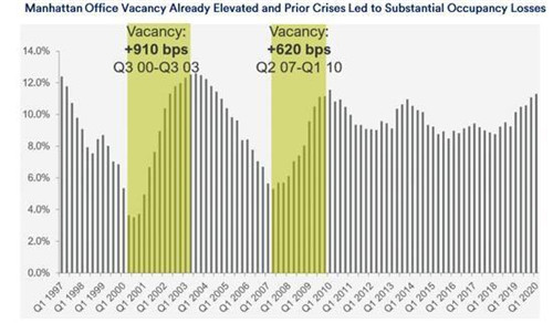 房地產咨詢公司高緯環(huán)球的歷史數據表明,在經濟衰退期間,曼哈頓寫字樓的空置率往往會飆升,而令人擔憂的是,早在2019年初,空置率其實已呈上升趨勢,疫情更是帶來了“致命一擊”。