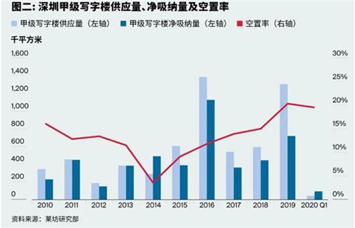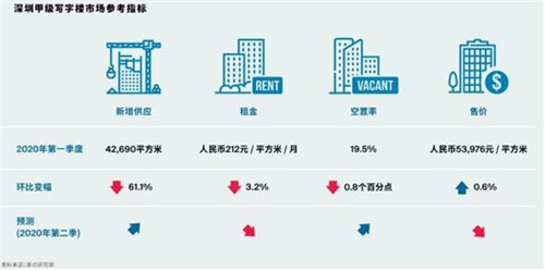 萊坊2020年第一季度《深圳寫字樓市場報告》顯示,當季甲級寫字樓新增42,690平方米供應,在該季度平均租金環比下跌3.2%至每月每平方米人民幣212元的優惠刺激下,凈吸納量達9.3萬平方米,使空置率環比小幅下降0.8個百分點至19.5%。