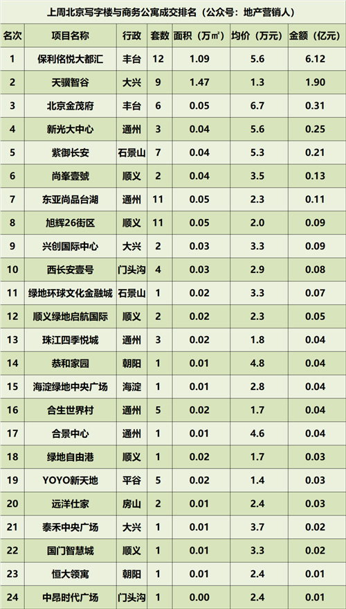 上周,北京寫字樓與商務公寓成交93套,成交面積3.07萬㎡,成交均價31769元/㎡,成交金額9.77億元。其中,保利佲悅大都匯以6.12億元的總成交額位居榜首。