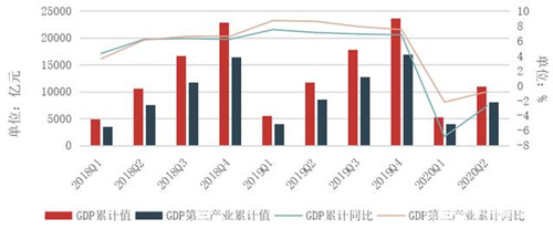 圖:2018年Q1~2020年Q2廣州GDP、第三產業累計值及同比