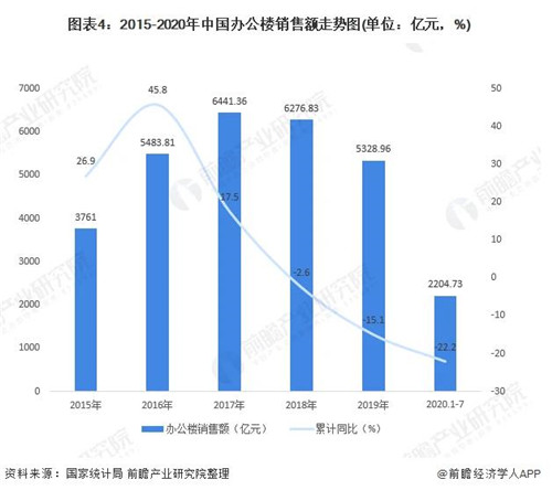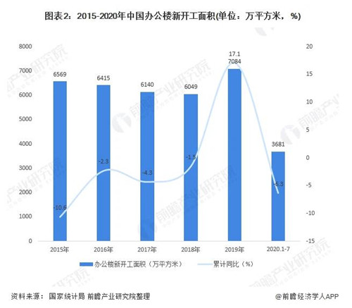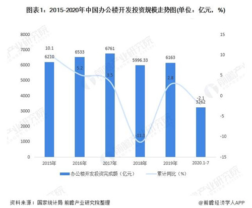 辦公樓指機關、企業、事業單位行政管理人員,業務技術人員等辦公的業務用房,現代辦公樓正向綜合化、一體化方向發展。辦公寫字樓是專業的商業辦公的場所。一般具有較好的地理位置,相關的物業和服務設施水平高,具有聚集的商業圈,效率較高。2018年,中國辦公樓開發投資規模跌破6000億元,僅為5996.33億元,2019年投資完成額略有回升,至6163億元,增長2.8%。2020年受新冠疫情影響,我國辦公樓發展受到較大沖擊,截止2020年7月,我國辦公樓開發投資規模下降2.1%至3262億元。