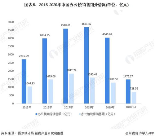 從我國辦公樓銷售細分結構看,我國辦公樓市場與住宅房地產市場一樣,以期房銷售為主,期房銷售占比達七成以上。2019年辦公樓期房銷售4040.61億元,占辦公樓銷售額比重的75.82%,辦公樓現房銷售1288.36億元,占比24.18%。