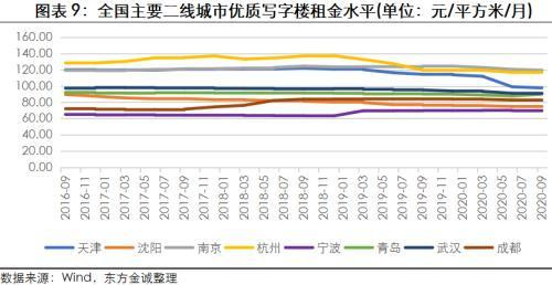 因寫字樓的地區聚集效應更為顯著,各城市間優質寫字樓租金存在較大差異。國企、央企總部多位于北京,得益于總部經濟效應,北京地區優質寫字樓租金與其它一線城市拉開較大距離。2020年9月末,北京優質寫字樓租金為416.10元/平方米/月,高出第二位的上海136.90元/平方米/月;同期末,深圳及廣州寫字樓租金分別為194.30元/平方米/月和163.80元/平方米/月,租金價格分別位列全國第三和第四位。此外,受益于長三角一體化背景下南京與杭州都市圈協調聯動的強化,南京和杭州優質寫字樓租金較高,2020年9月末分別為119.40元/平方米/月和116.70元/平方米/月,位居二線城市前列,其余二線城市每平方米月租金均不超過100元。同期末,受新冠疫情影響,全國主要城市寫字樓租金也普遍下降,但相較于零售物業租金而言,降幅較小。