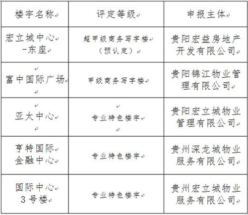 房訊網訊 近日,2021年貴陽首批商務樓宇評定達標樓宇評審結果進入公示。此次商務樓宇等級評定中,南明區共有12棟商務寫字樓申報參評。經資格預審、書面評審、現場測評、暗訪及滿意度調查等環節,今年3月13日完成首次評定工作各項流程,根據兩項團體標準,其中5棟商務樓宇分別達到相應認定標準。